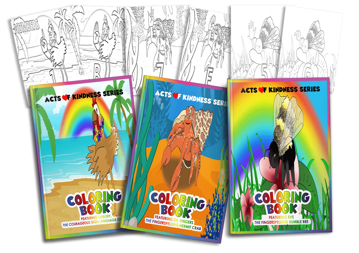 The Acts of Kindness Series features hundreds of characters such as Chelsey “The Courageous Sign Language Chicken,” Eve “The Fingerspelling Bumblebee,” and Hairey “The Hard of Hearing Rabbit.”